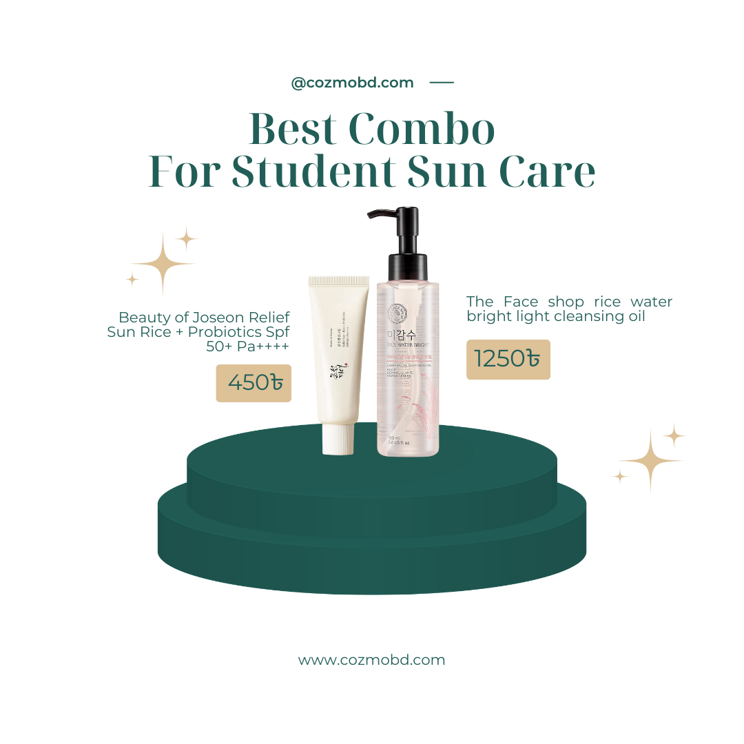 Protect and refresh your skin with Beauty of Joseon Relief Sun SPF 50+ and The Face Shop Rice Water Bright Cleansing Oil – an essential sun care combo for students.