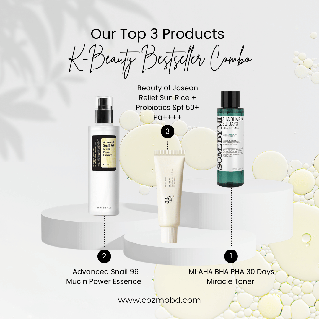 A bestselling Korean skincare bundle featuring COSRX Snail 96 Essence, Beauty of Joseon Relief Sun SPF 50+ and SOME BY MI 30 Days Miracle Toner – the top picks for K-beauty lovers.