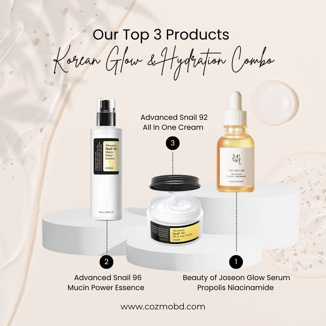 Achieve glowing and deeply hydrated skin with COSRX Snail 96 Essence, COSRX Snail 92 Cream and Beauty of Joseon Glow Serum – a complete Korean glow set.